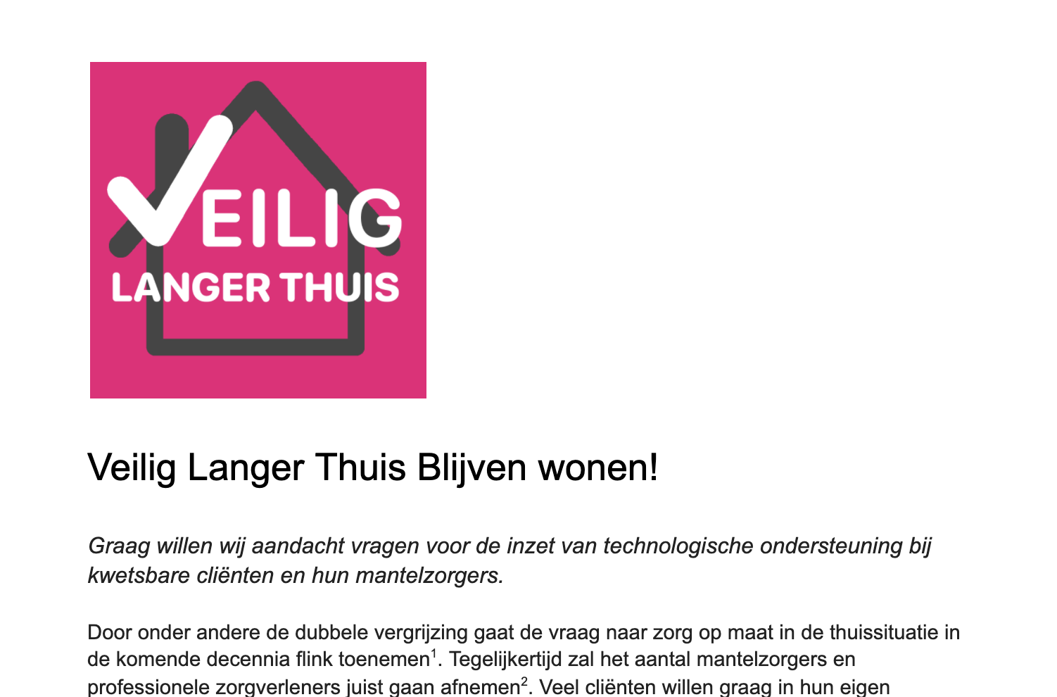 In dit project slaan ervaren therapeuten en een implementatiecoach de handen ineen om het veilig langer thuis wonen te bevorderen. Dit doen we door uw behoeften en wensen te onderzoeken, passende technologische hulpmiddelen te adviseren en het gebruik hiervan te begeleiden.